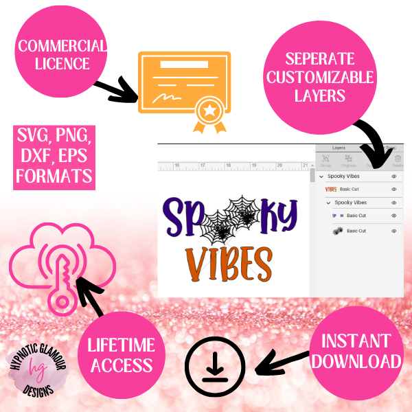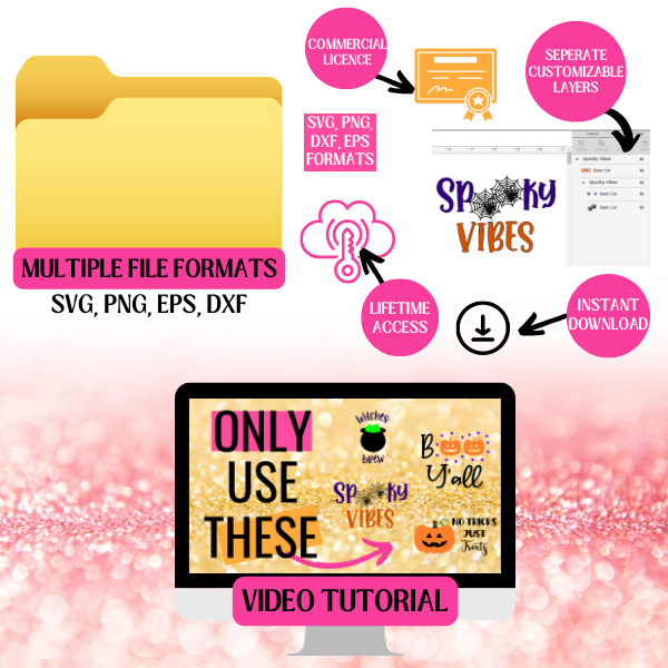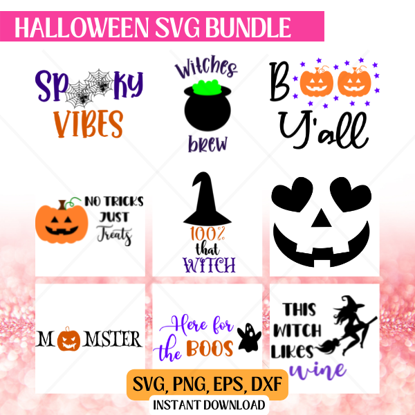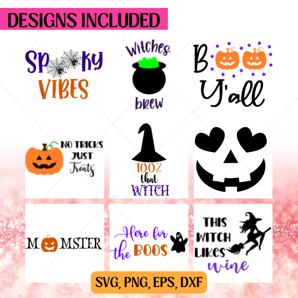 - 9 Halloween-themed designs in the following formats: SVG, PNG, EPS, and DXF